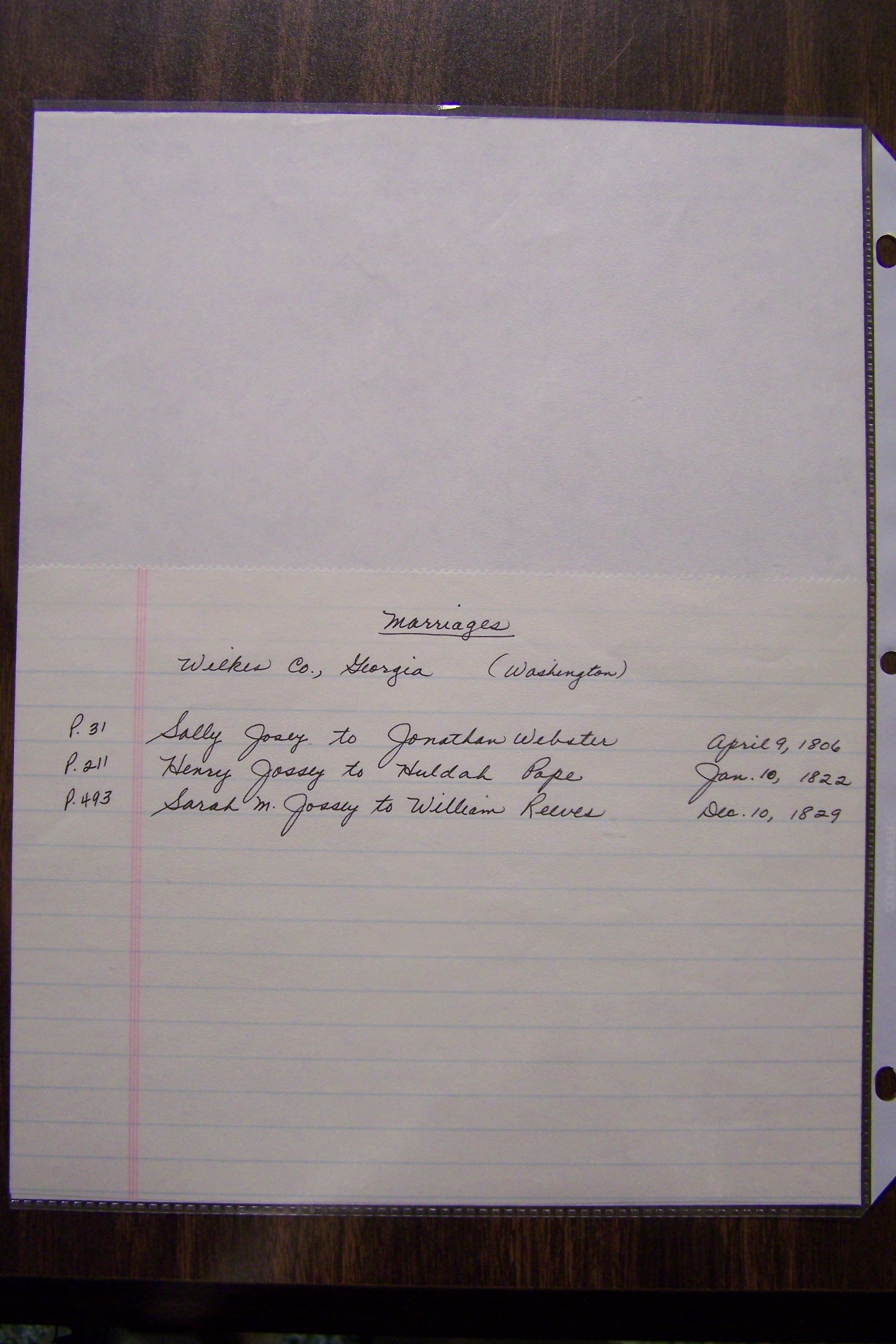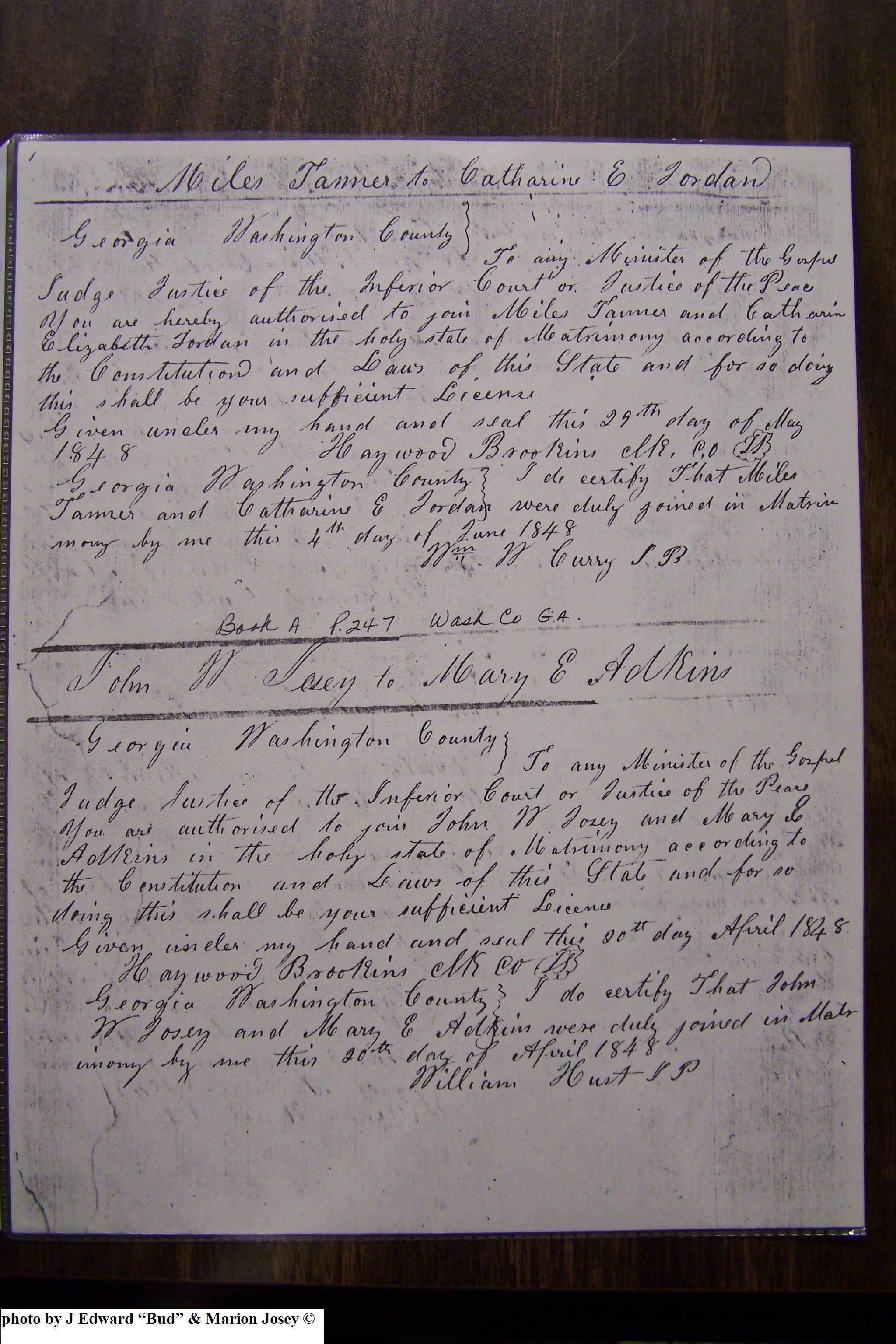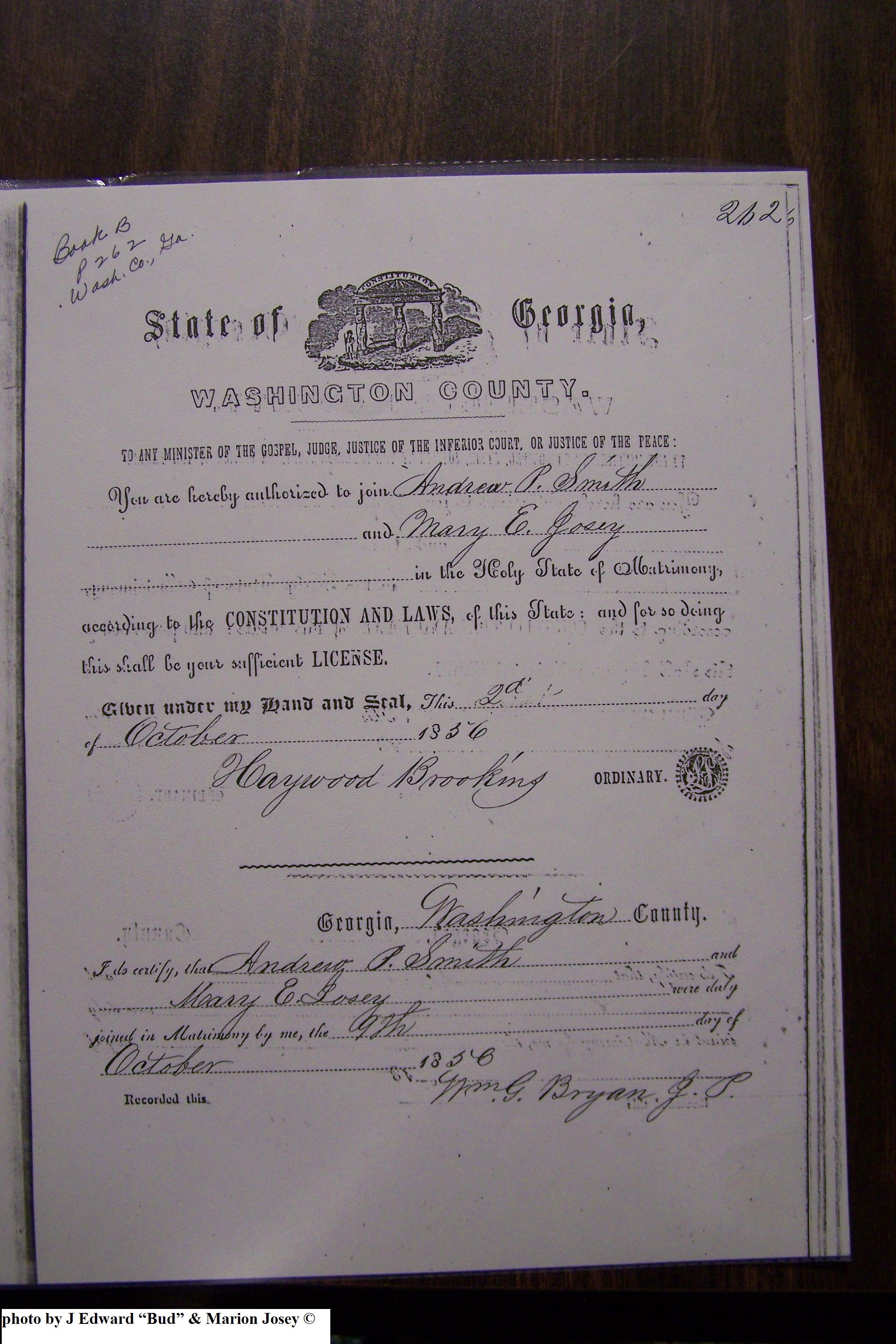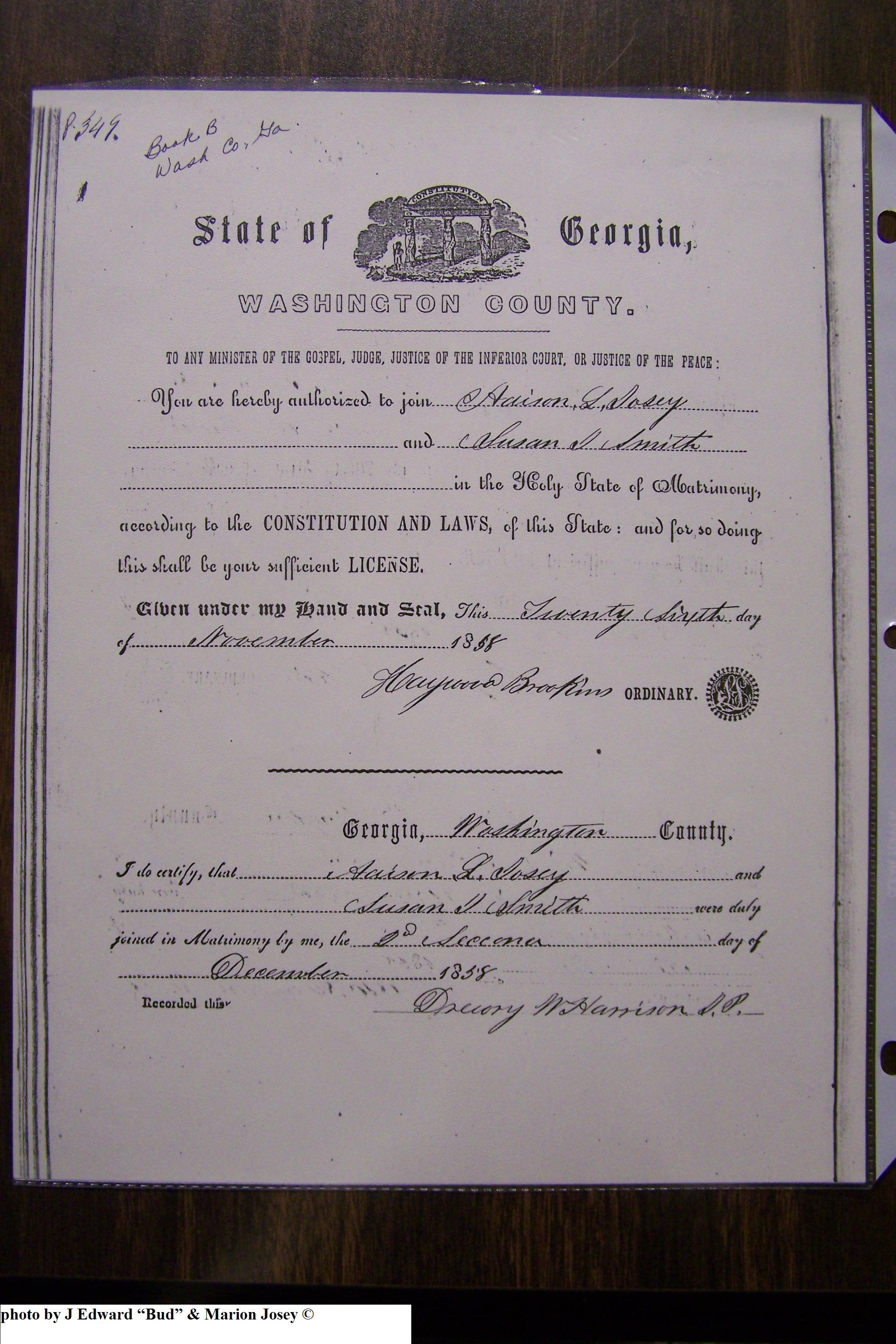 Josey Marriage Lic Washington Co, GA, pg 1, 116.JPG