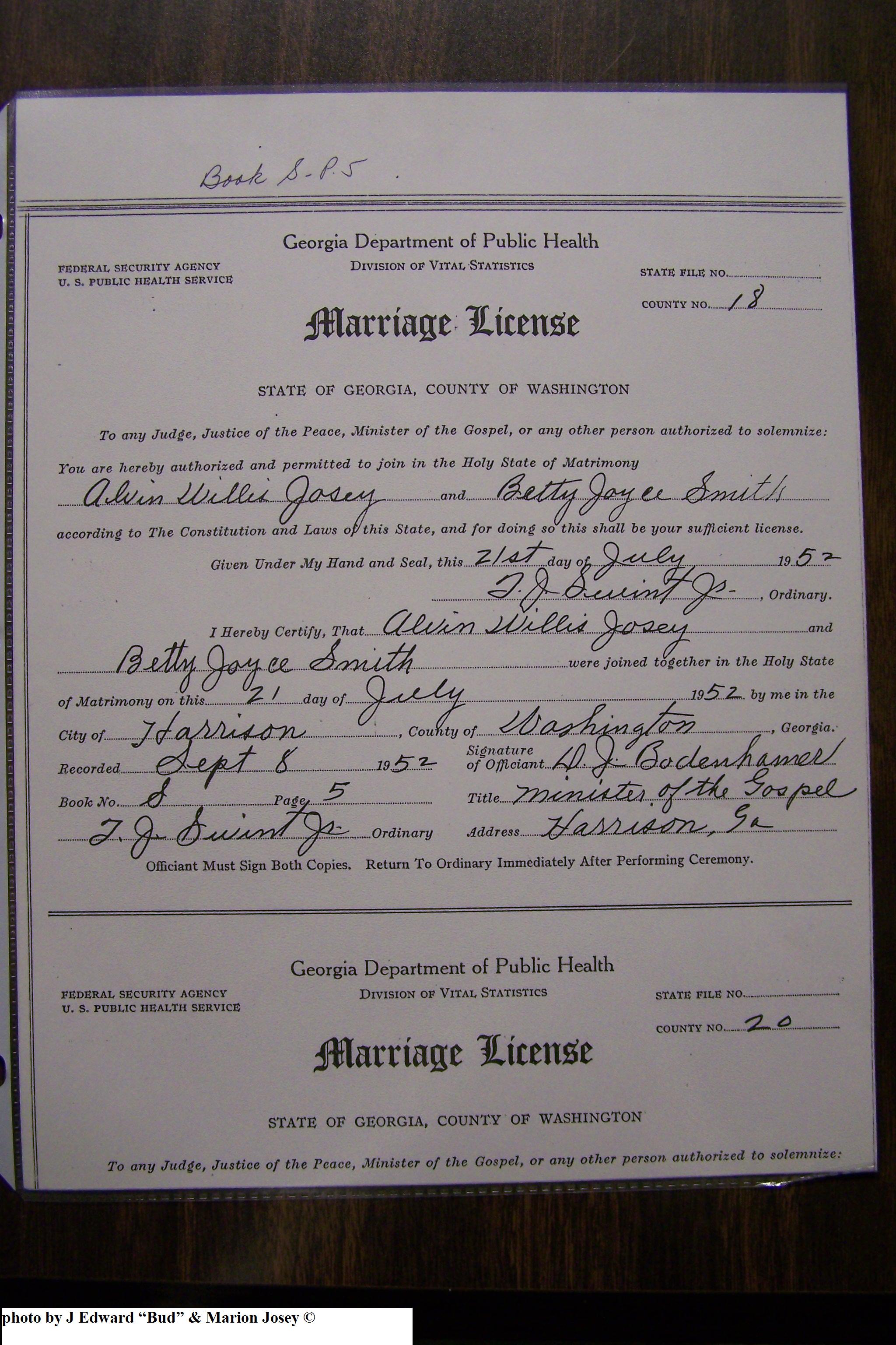 Josey, Alvin Willis & Betty Joyce Smith, Marriage Lic 182.JPG
