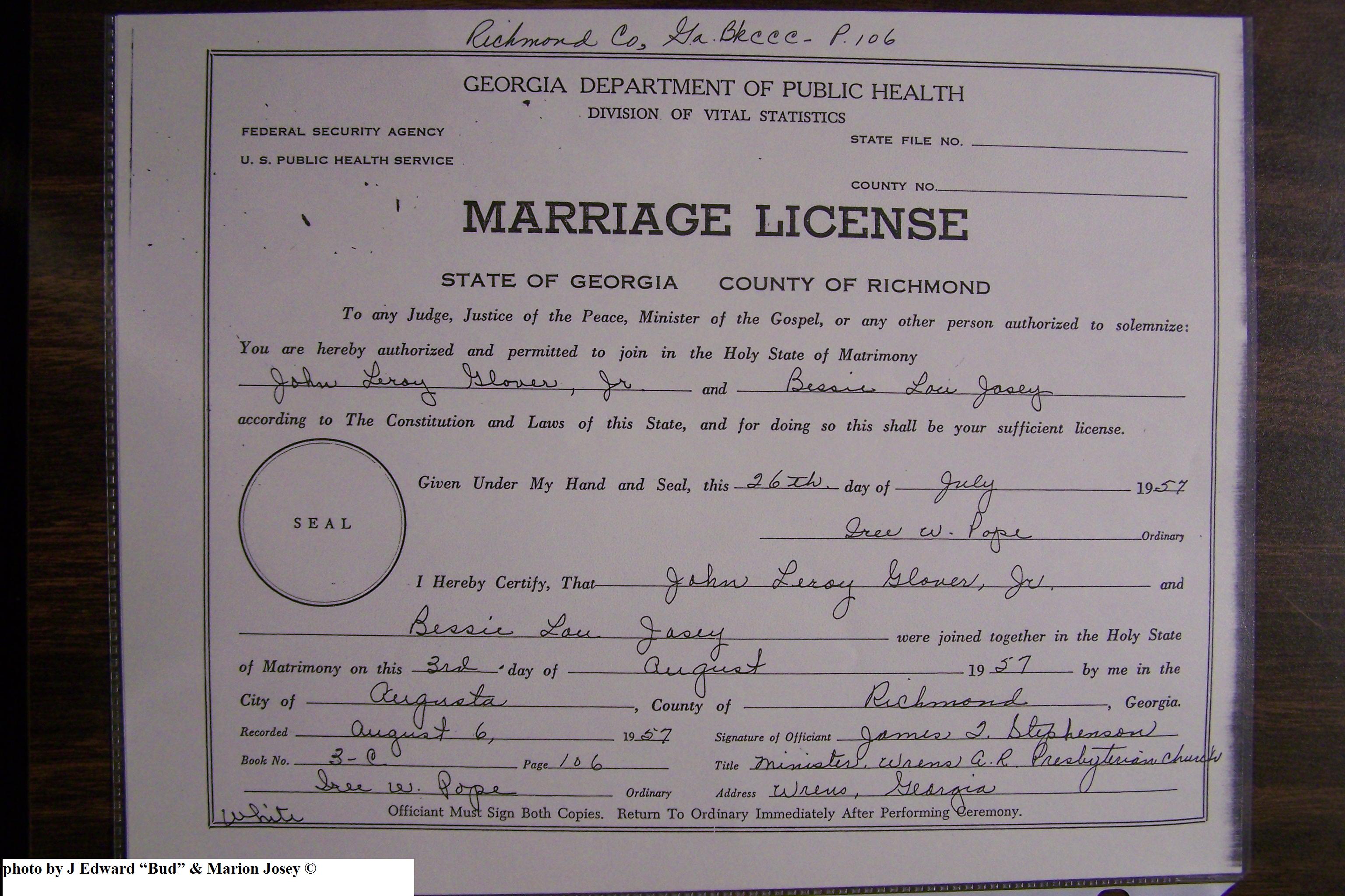 Josey, Bessie Lou & John Leroy Glover Jr, Marriage Lic 093.JPG