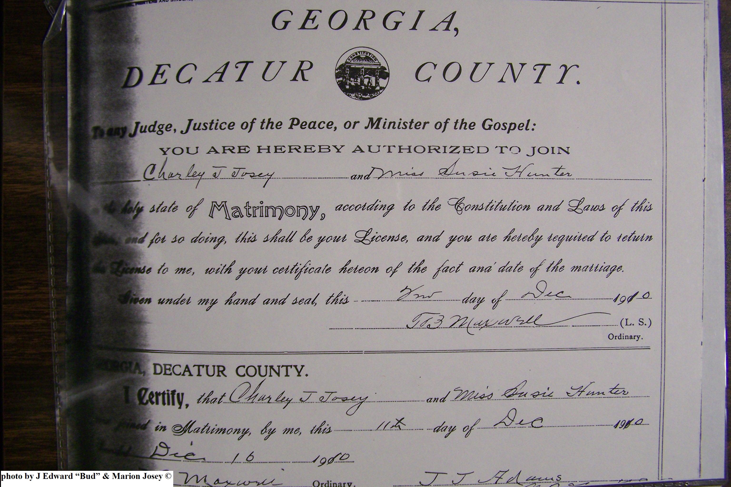 Josey, Charles Joel & Susie Hunter, Marriage Lic 058.JPG