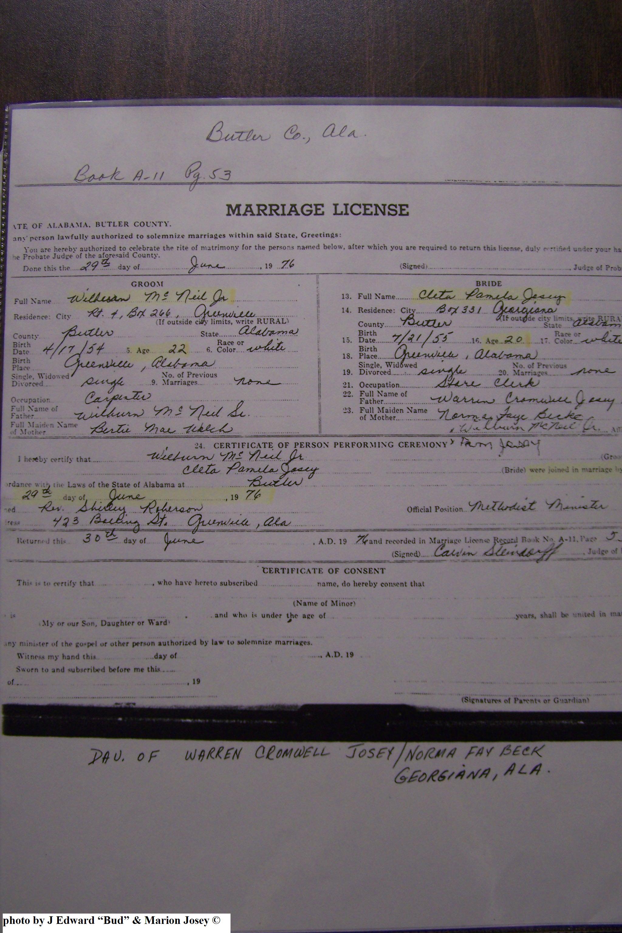Josey, Cleta Pamela & Wilburn McNeil Jr, Marriage Lic 028.JPG