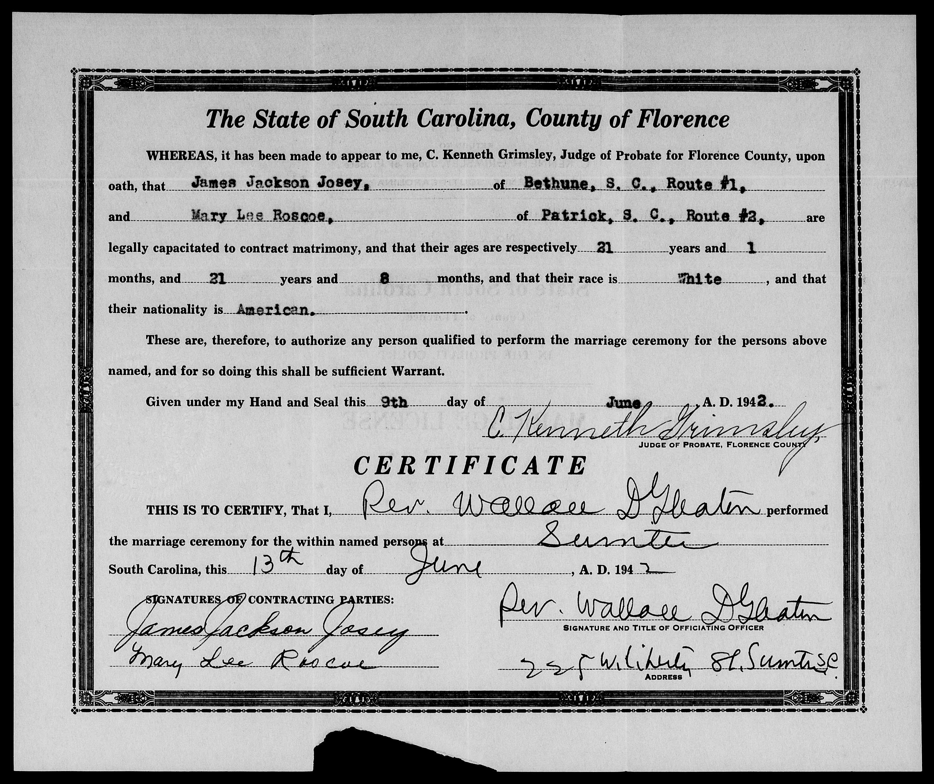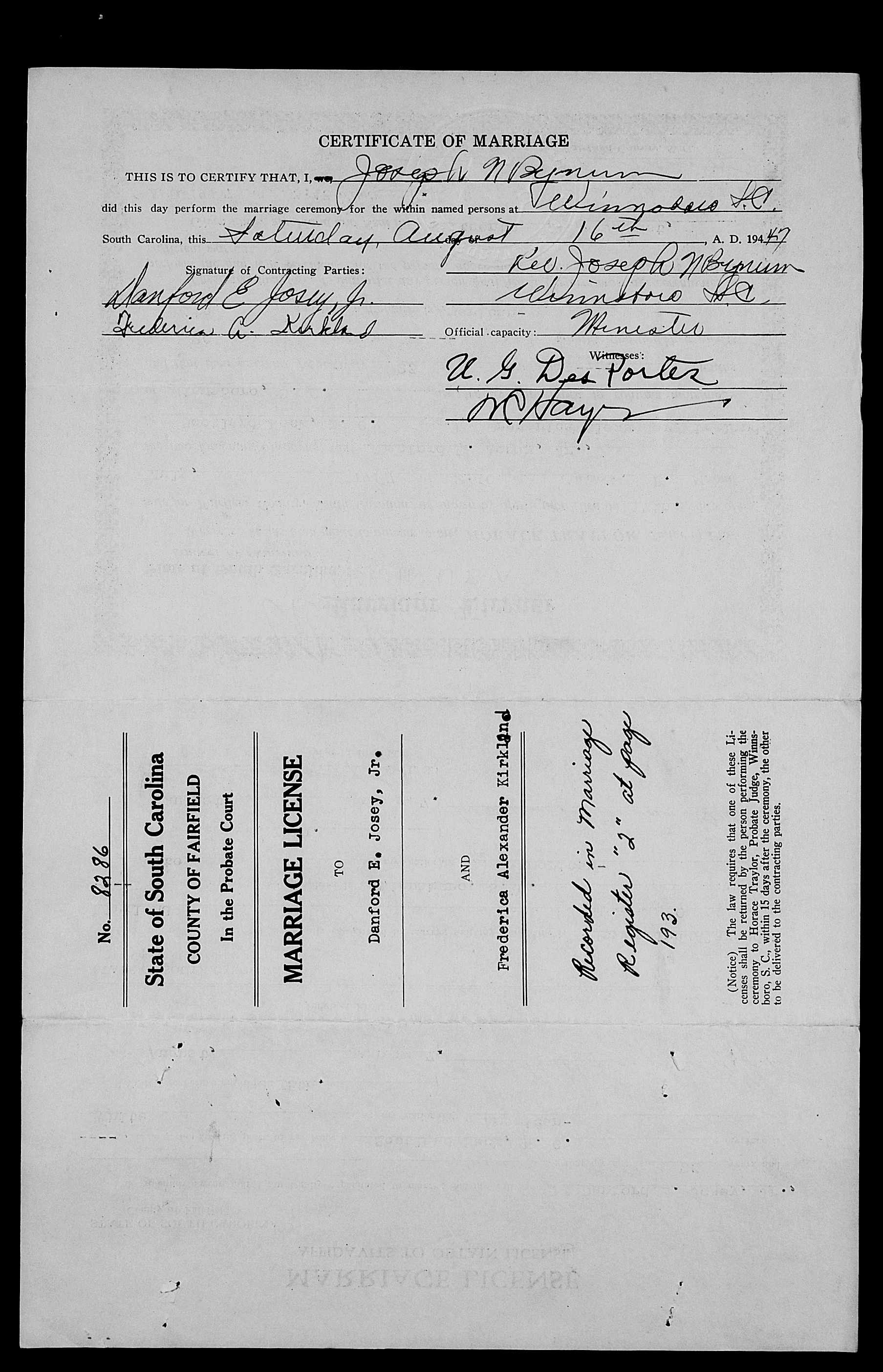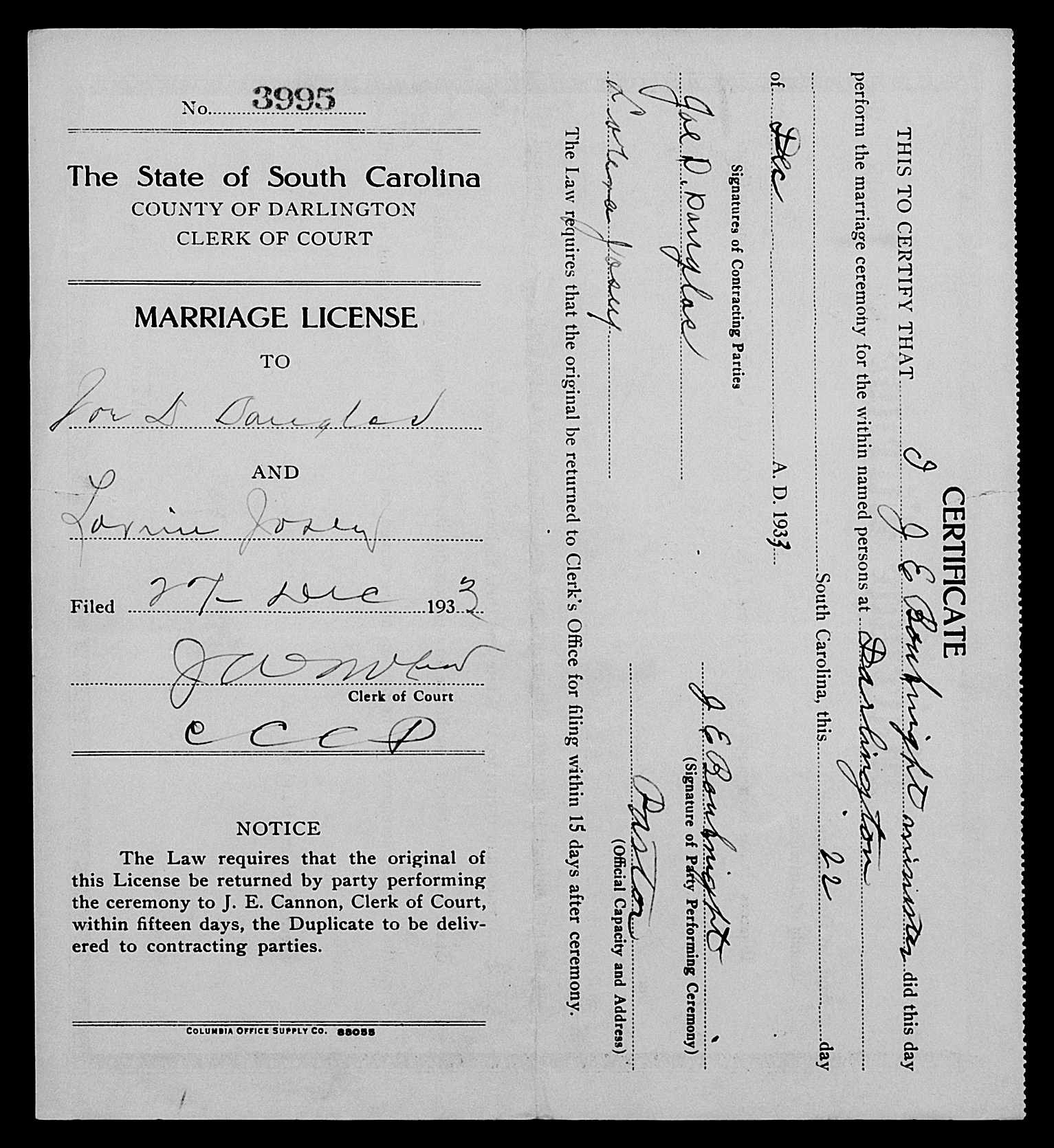 Josey, Alice Lee & John King Lominack Jr, Marriage Lic 095.JPG