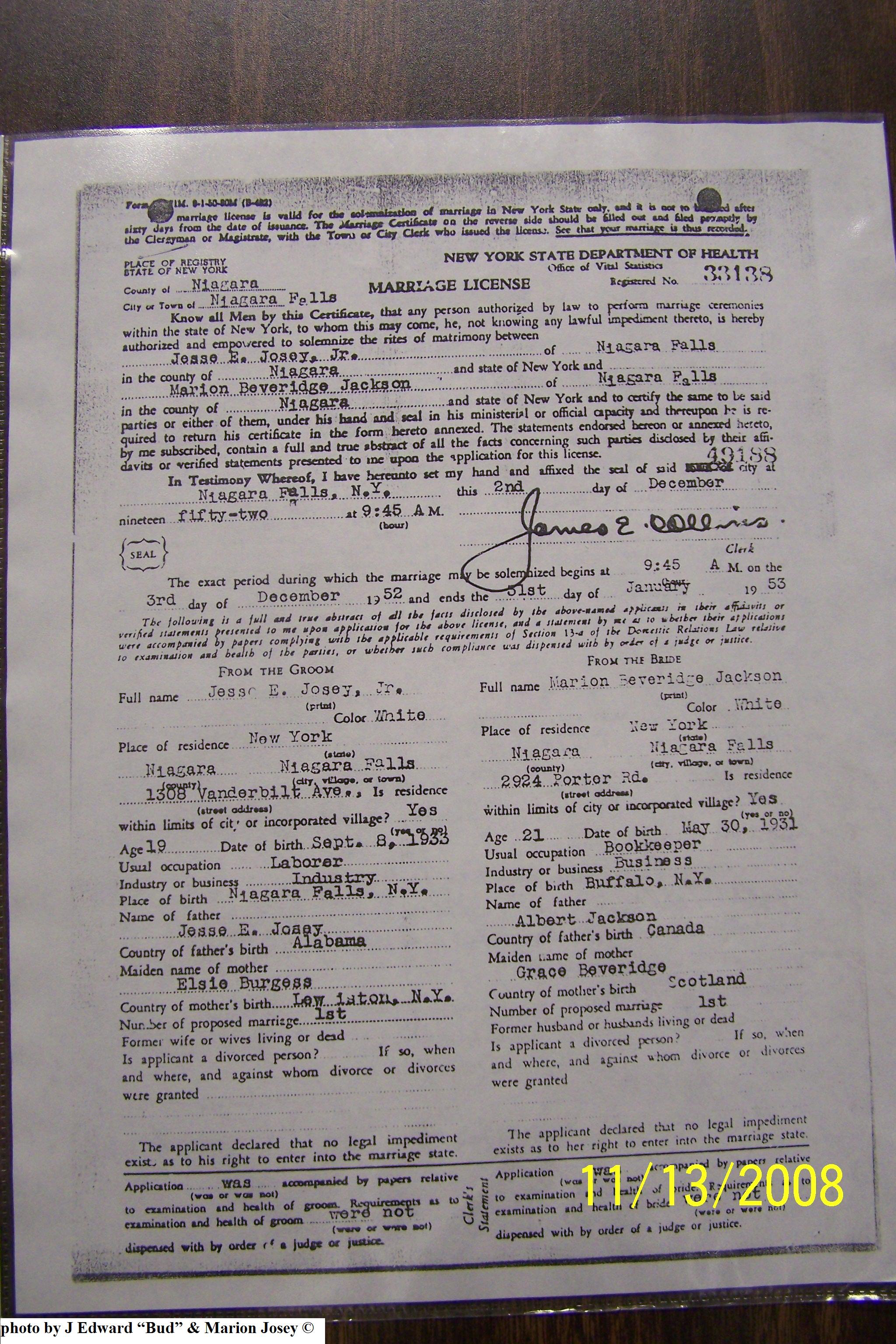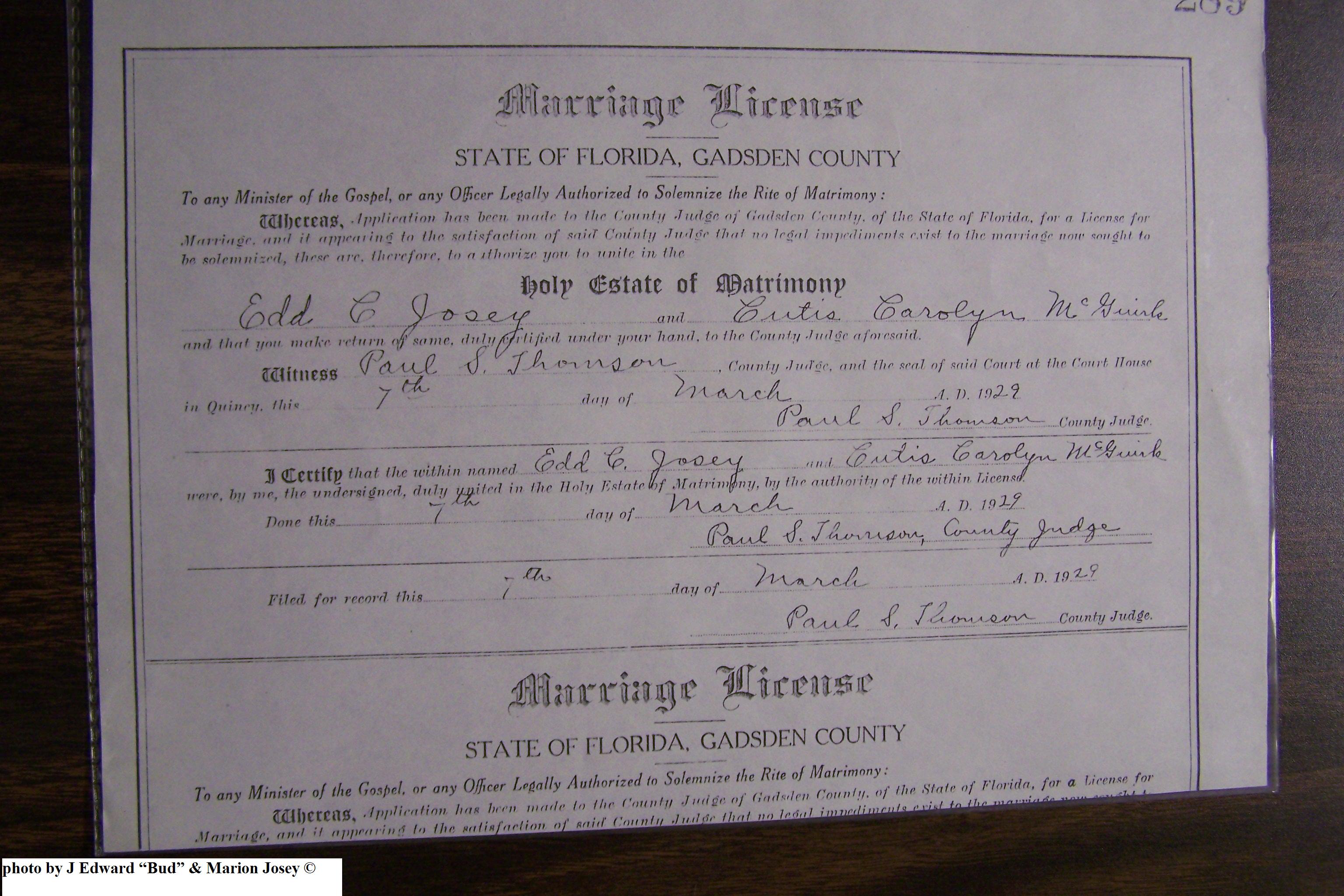 Josey, Edward C & Curtis Carolyn McGuirk, Marriage Lic 035.JPG