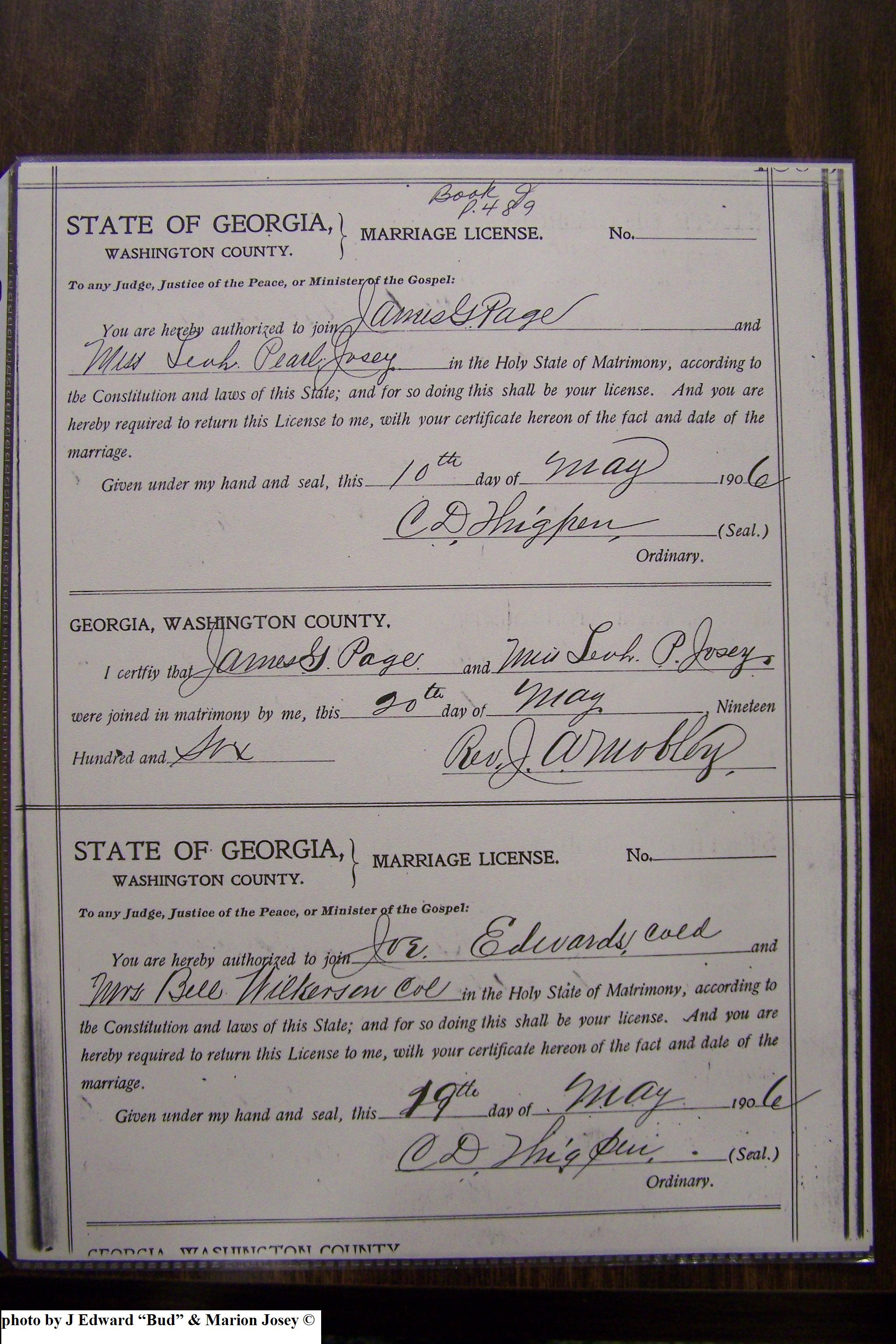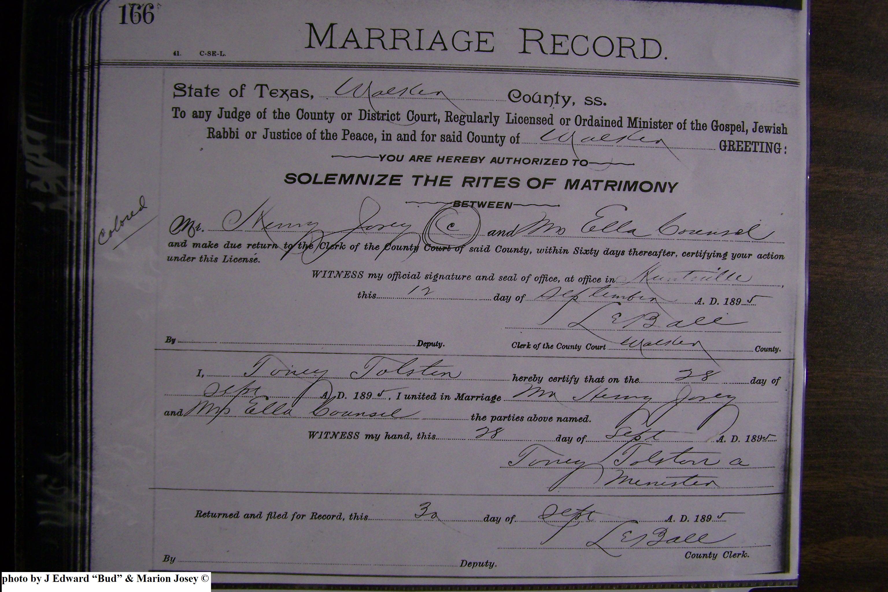Josey, Alice & W A Colson, Marriage Lic 167.JPG