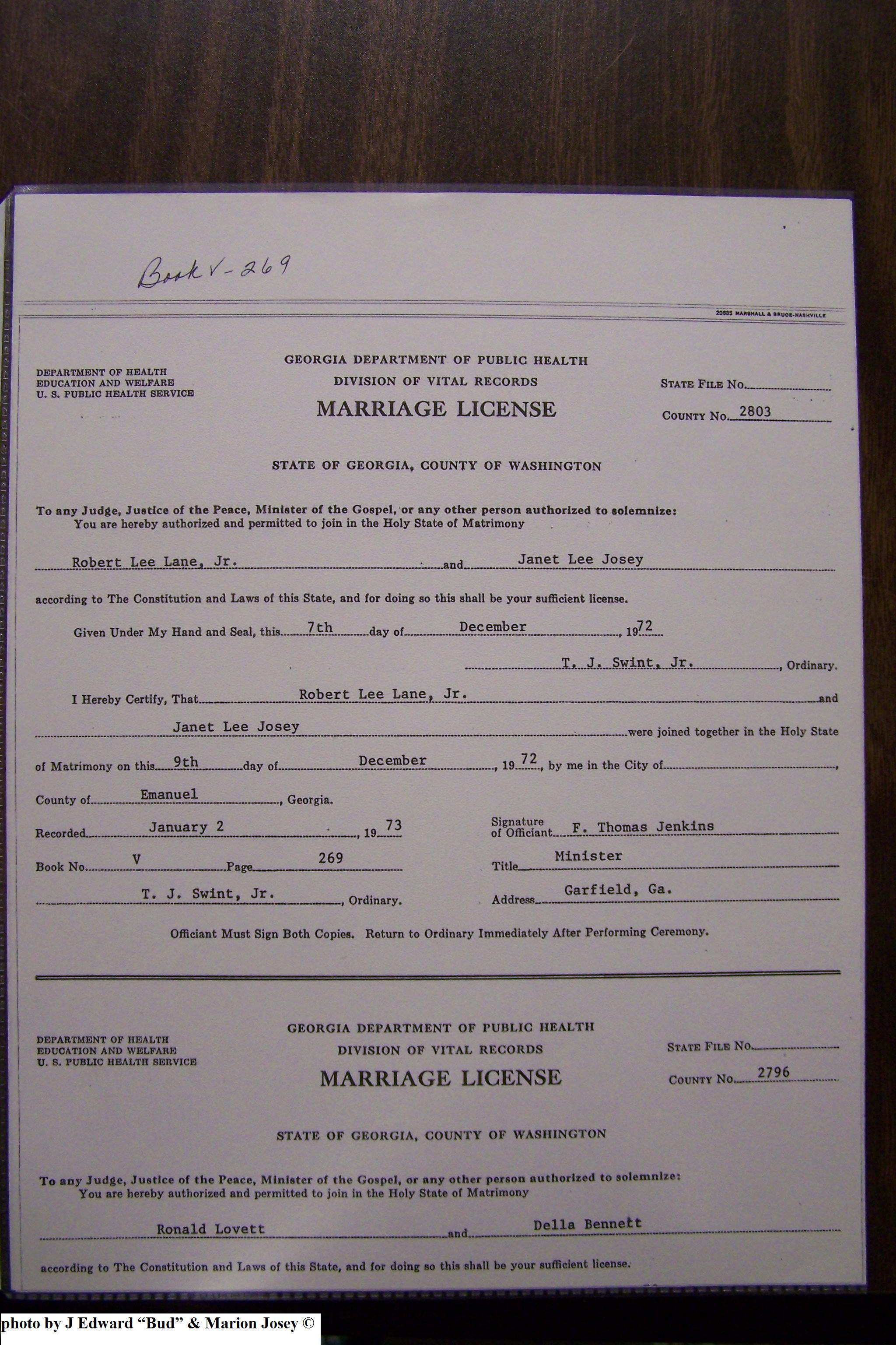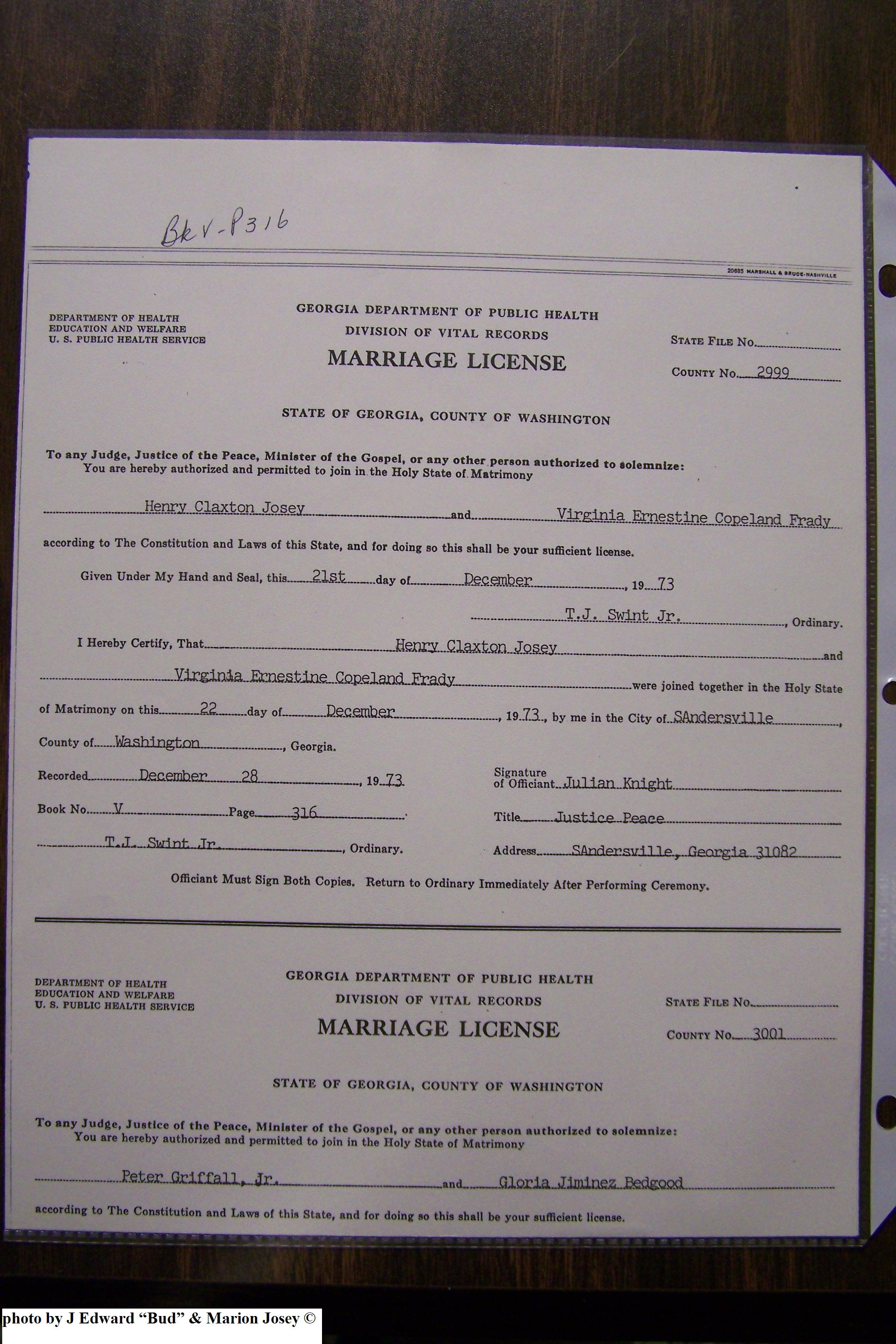 Josey, William Thomas & Vonnie Lee Etheridge, Marriage Lic 160.JPG