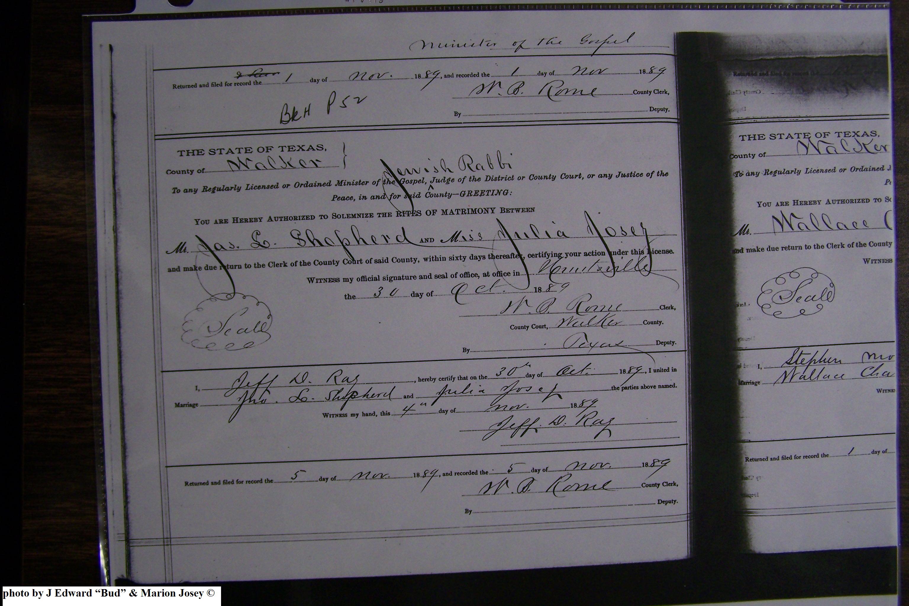 Josey, Sallie Estelle & John Ralph Sheppard, Marriage Lic 155.JPG