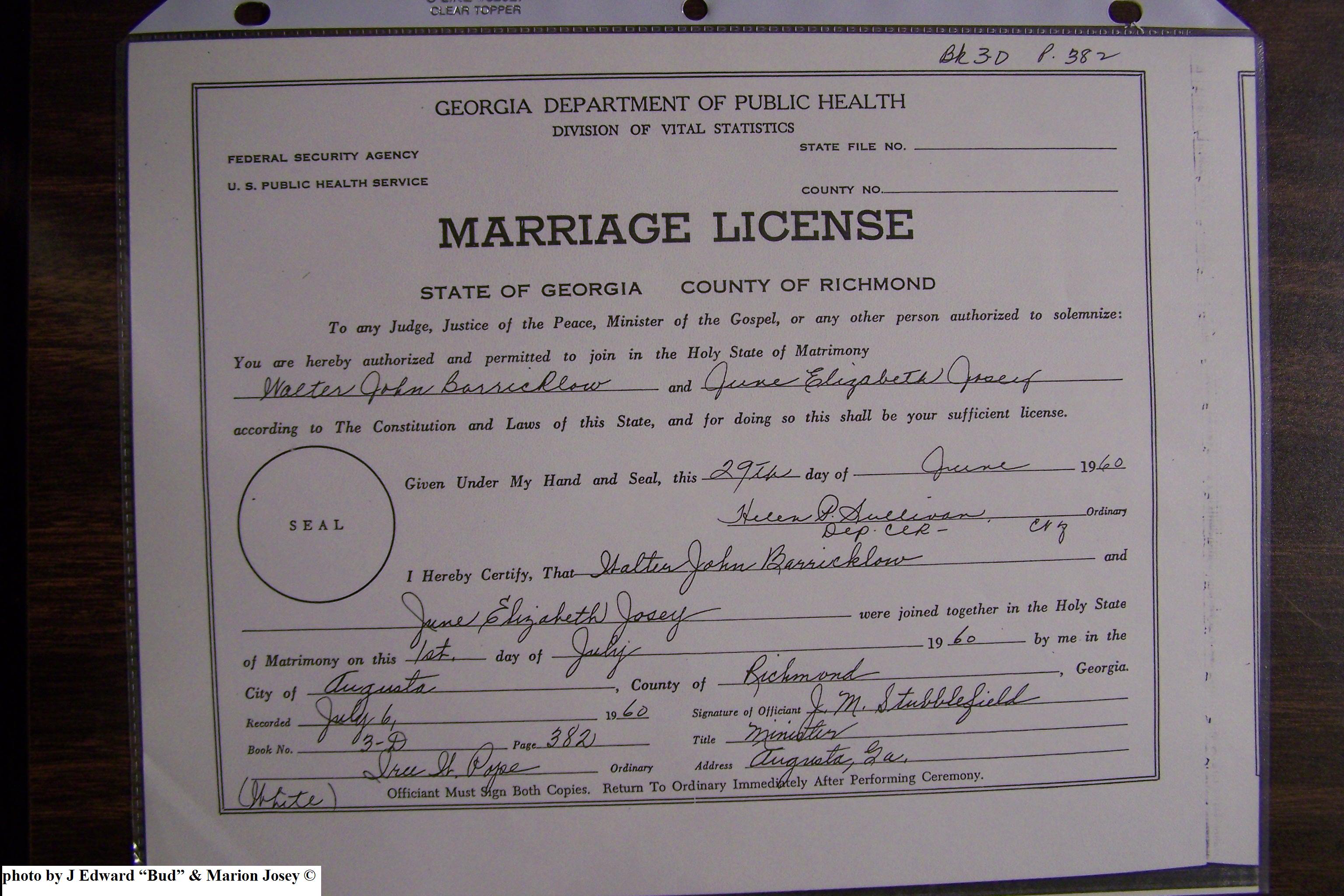 Josey, Ronald David & Margie Tilman Barrow, Marriage Lic 004.JPG