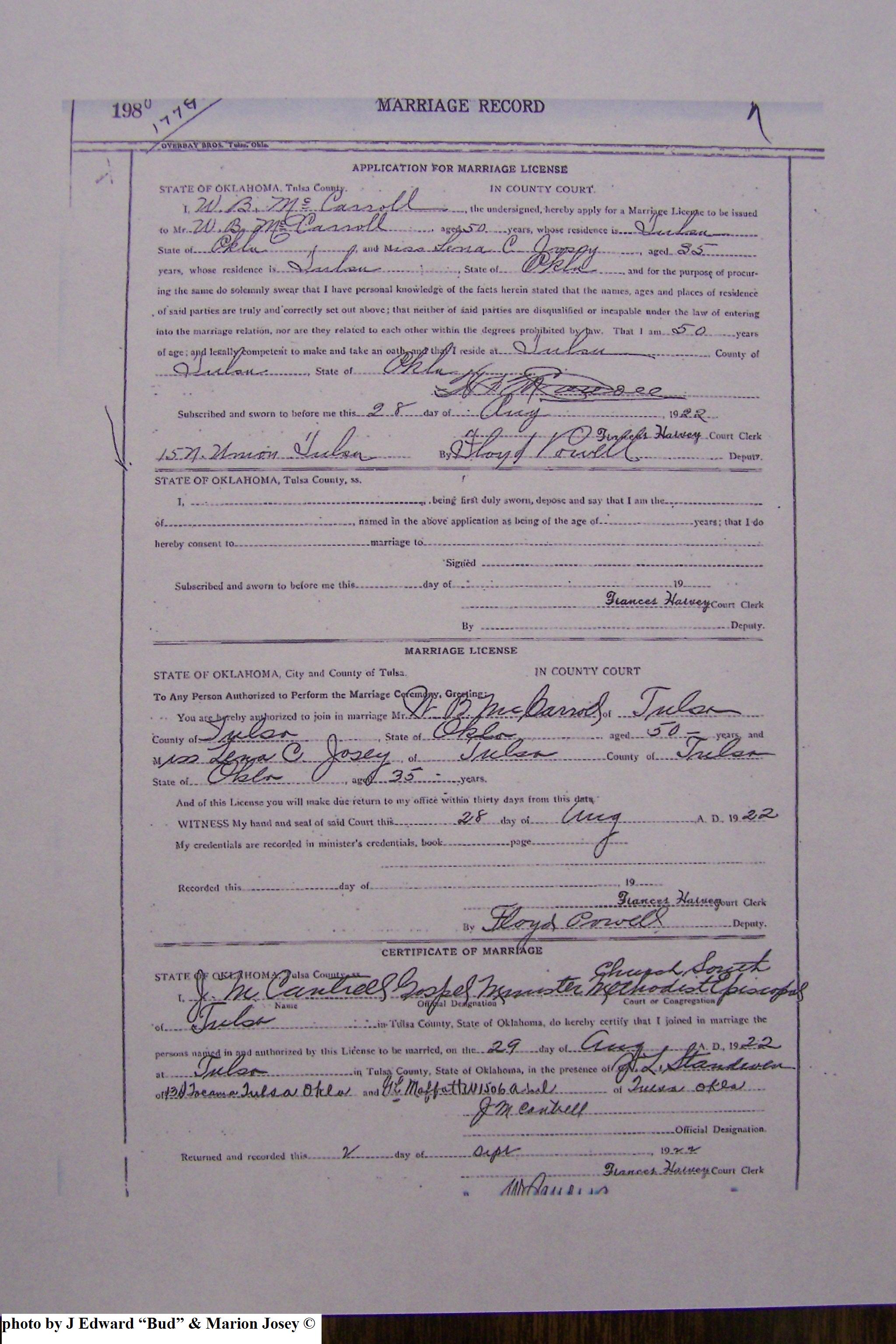 Josey, Clarence Frederick & Lucille McCollum, Marriage Lic 077.JPG