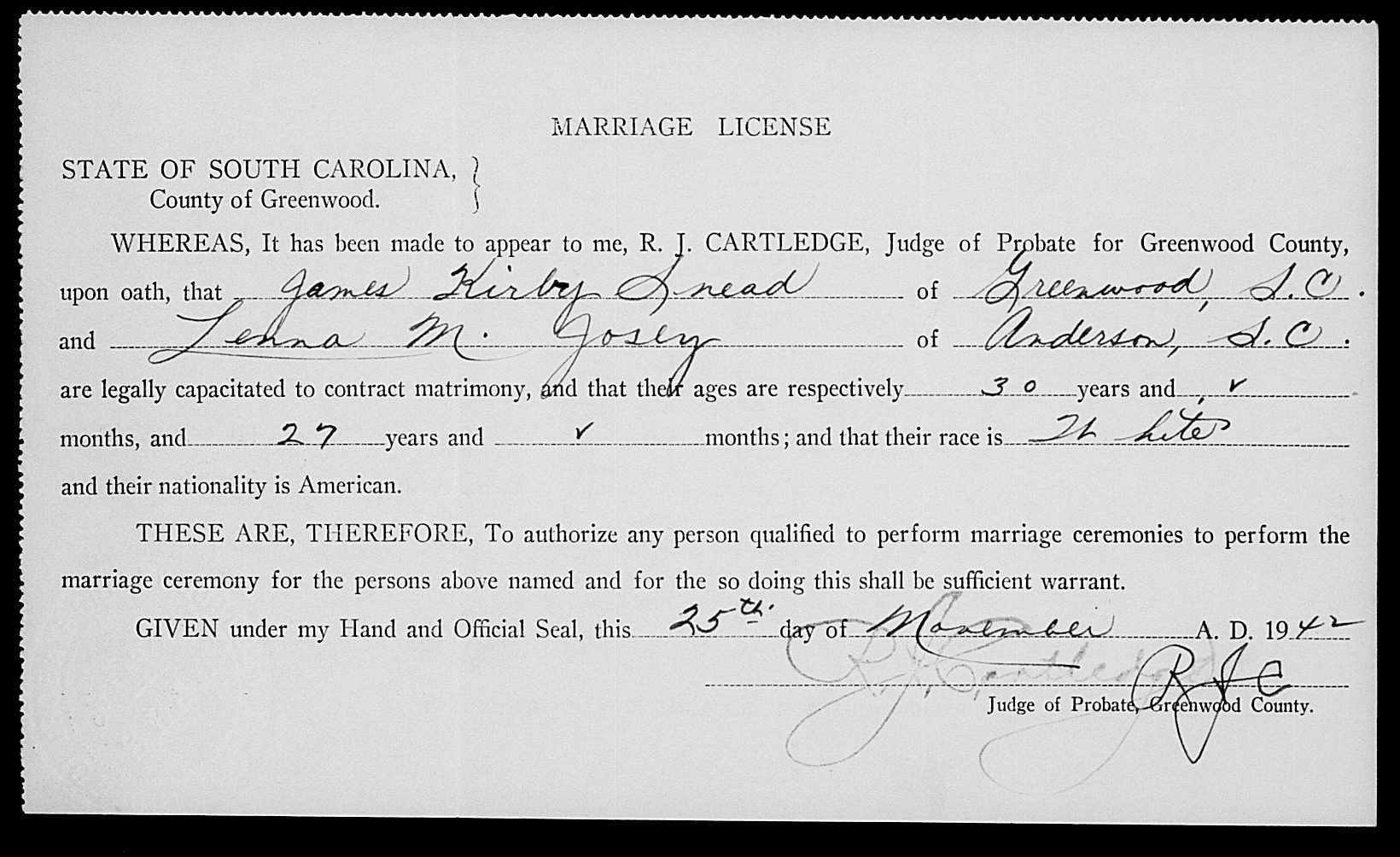 Josey, William Carroll & Kathleen Wiley, Marriage Lic 219.JPG