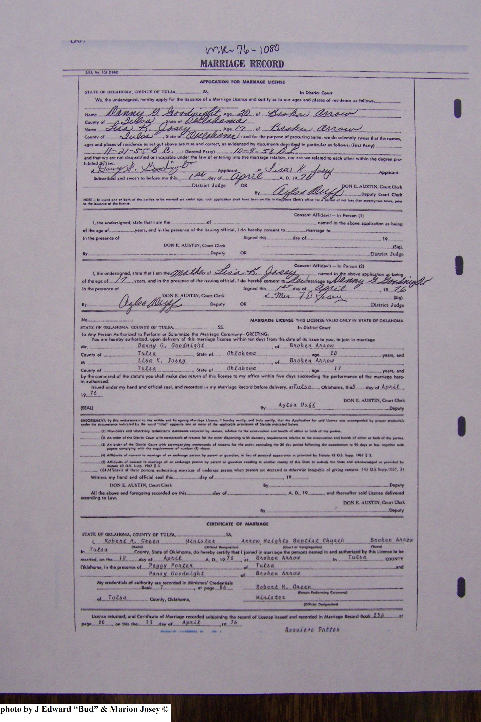 Josey, Ronald Arlie & Wilma Etheridge, Marriage Lic 092.JPG