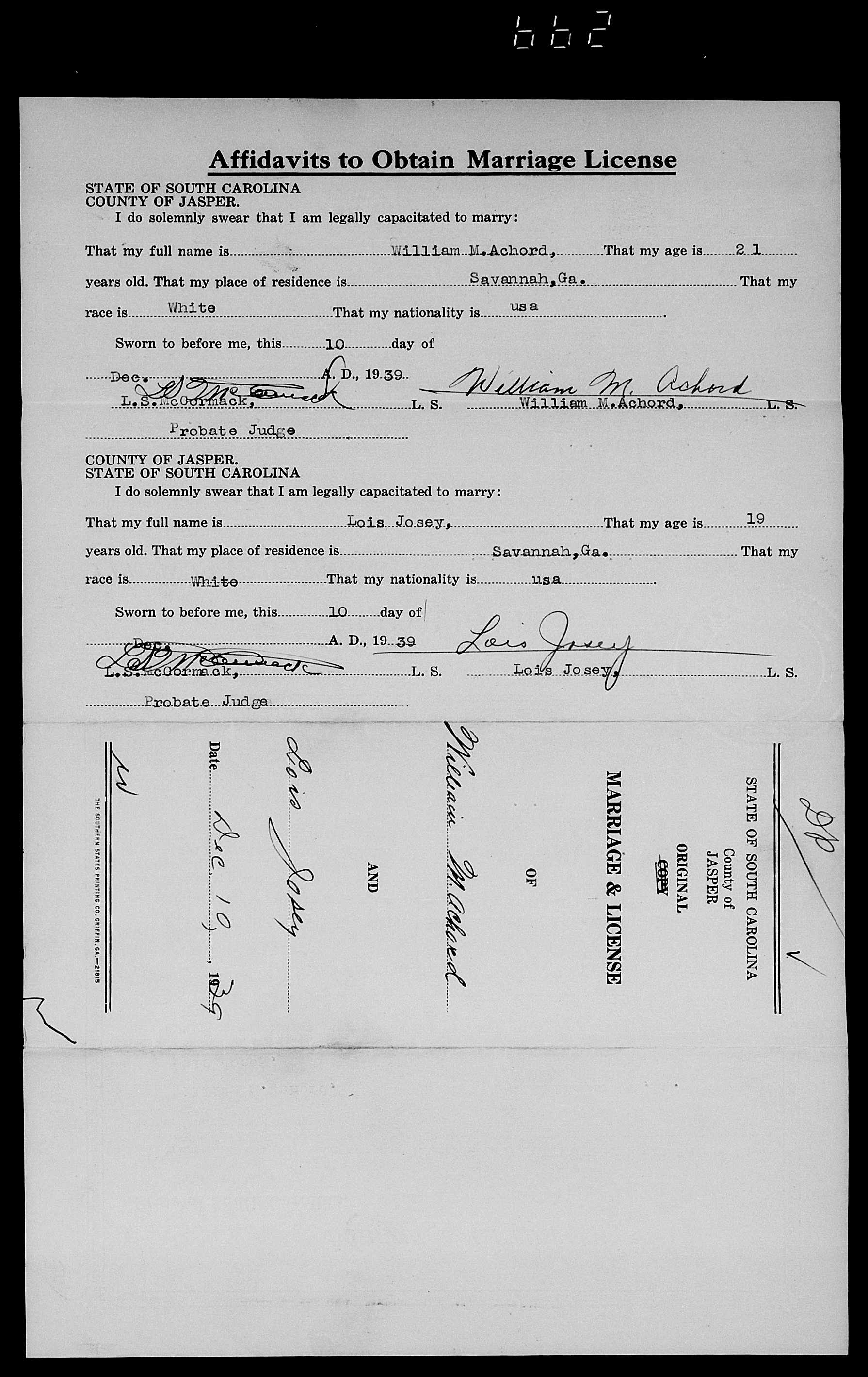 Josey, William Ellis Jr & Madge Connors Speir, Marriage Lic 074.JPG