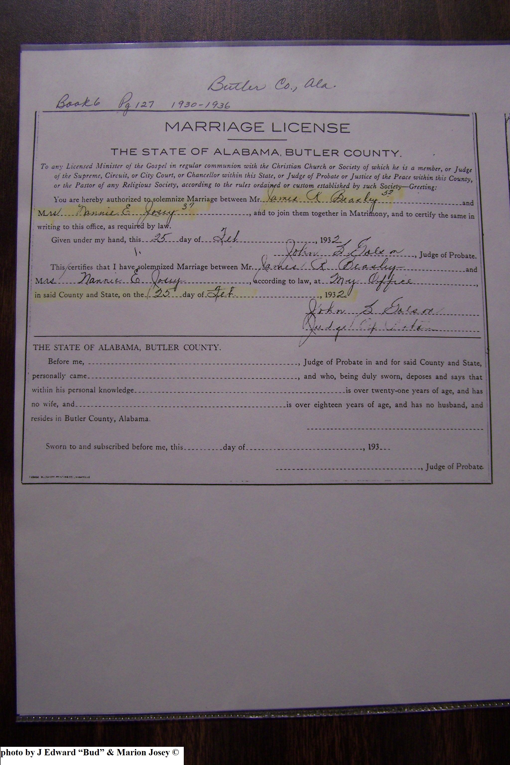 Josey, Bessie & Sam Reed, Marriage Lic 033.JPG