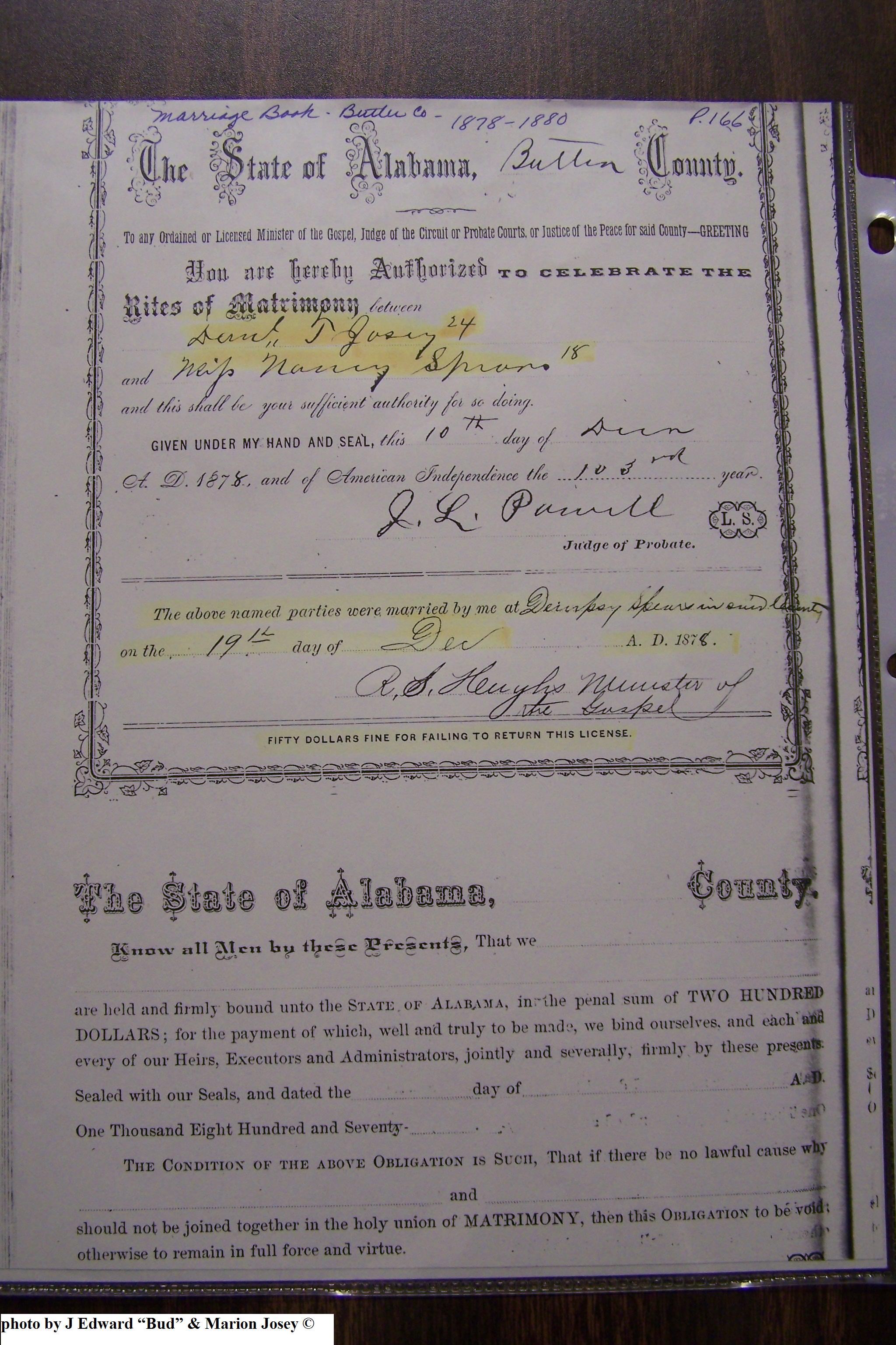 Josey, Daniel Thomas & Nancy Spears, Marriage Lic 020.JPG