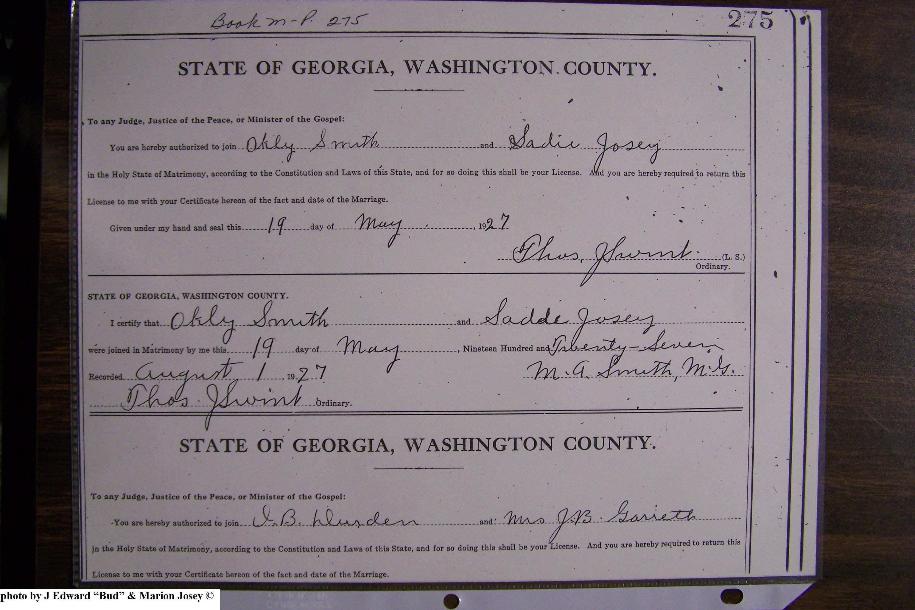 Josey, Sadie Loraine & William Oakley Smith, Marriage Lic 165.JPG